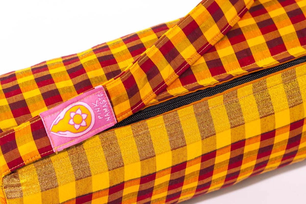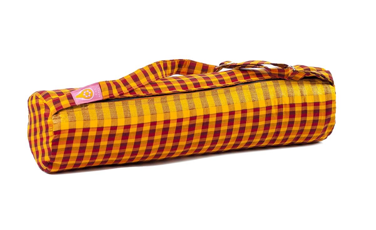 These beautiful Yoga mat bags are handmade in Coimbatore, South India, using saris as the primary material. Double Zipper. They have a little secret pocket-safe inside and are lined with pure cotton. Each model is a limited edition with no more than 7 unique bags available.