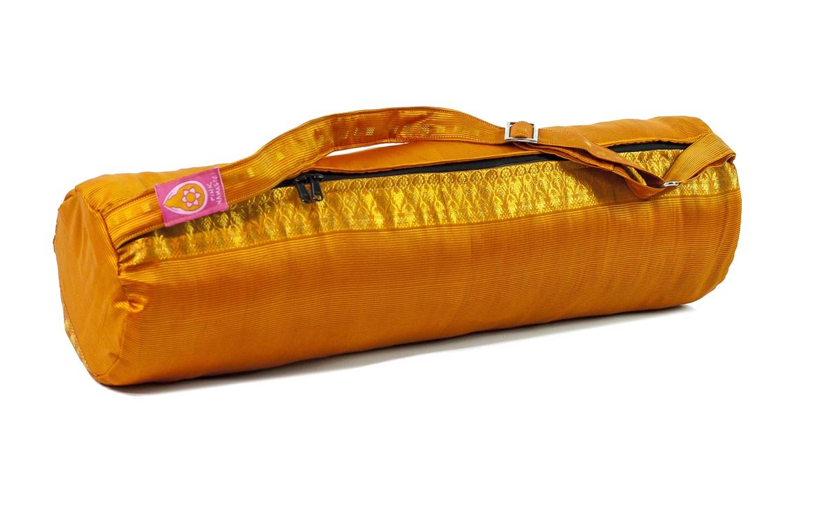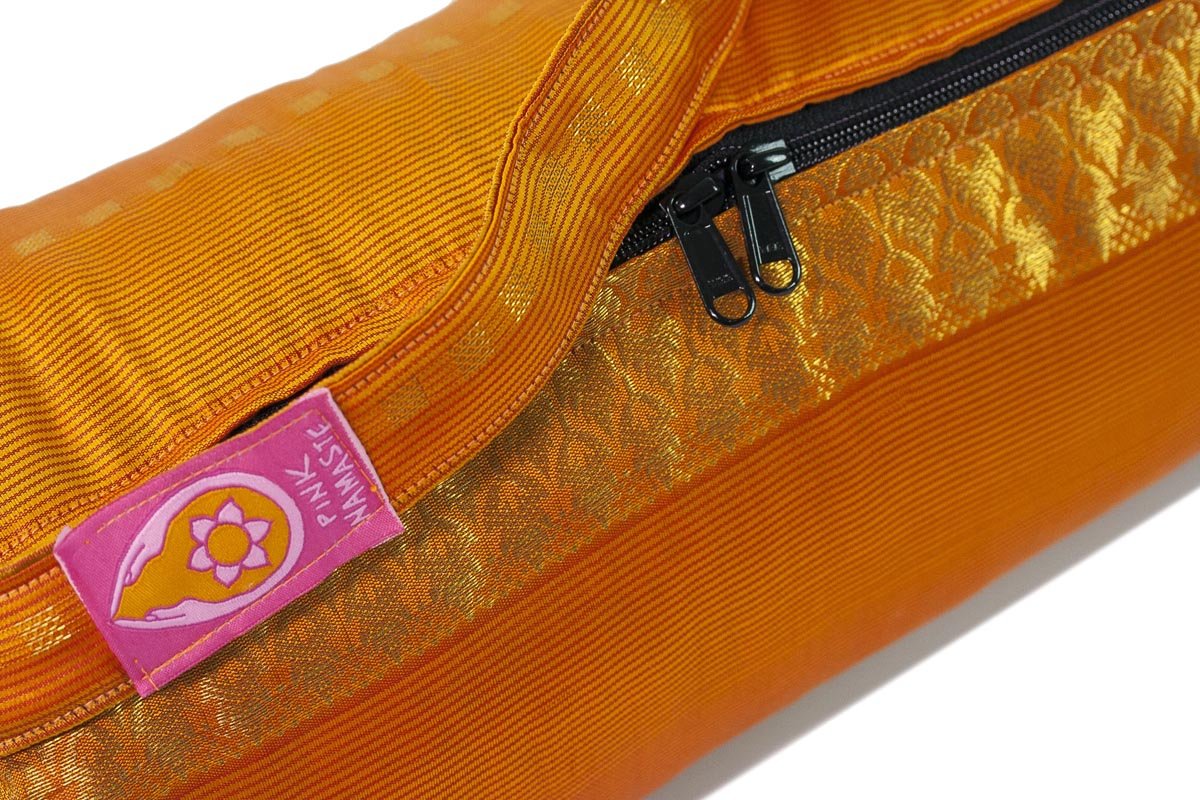 These beautiful Yoga mat bags are handmade in Coimbatore, South India, using saris as the primary material. Double Zipper. They have a little secret pocket-safe inside and are lined with pure cotton. Each model is a limited edition with no more than 7 unique bags available.