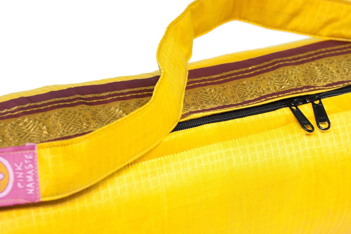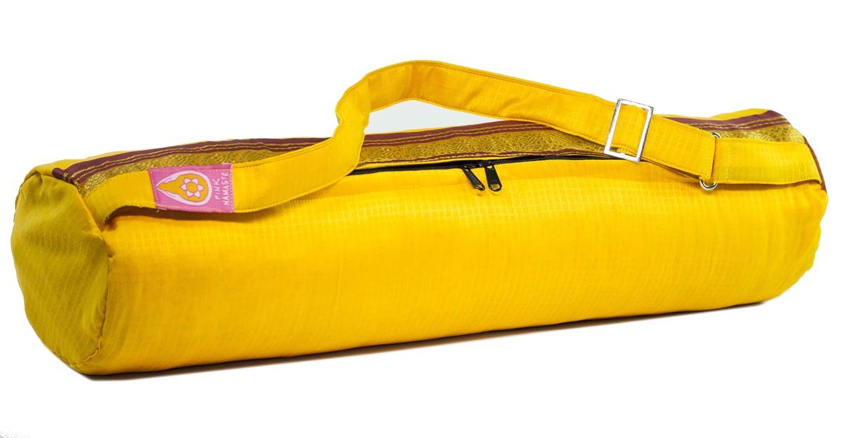 These beautiful Yoga mat bags are handmade in Coimbatore, South India, using saris as the primary material. Double Zipper. They have a little secret pocket-safe inside and are lined with pure cotton. Each model is a limited edition with no more than 7 unique bags available.