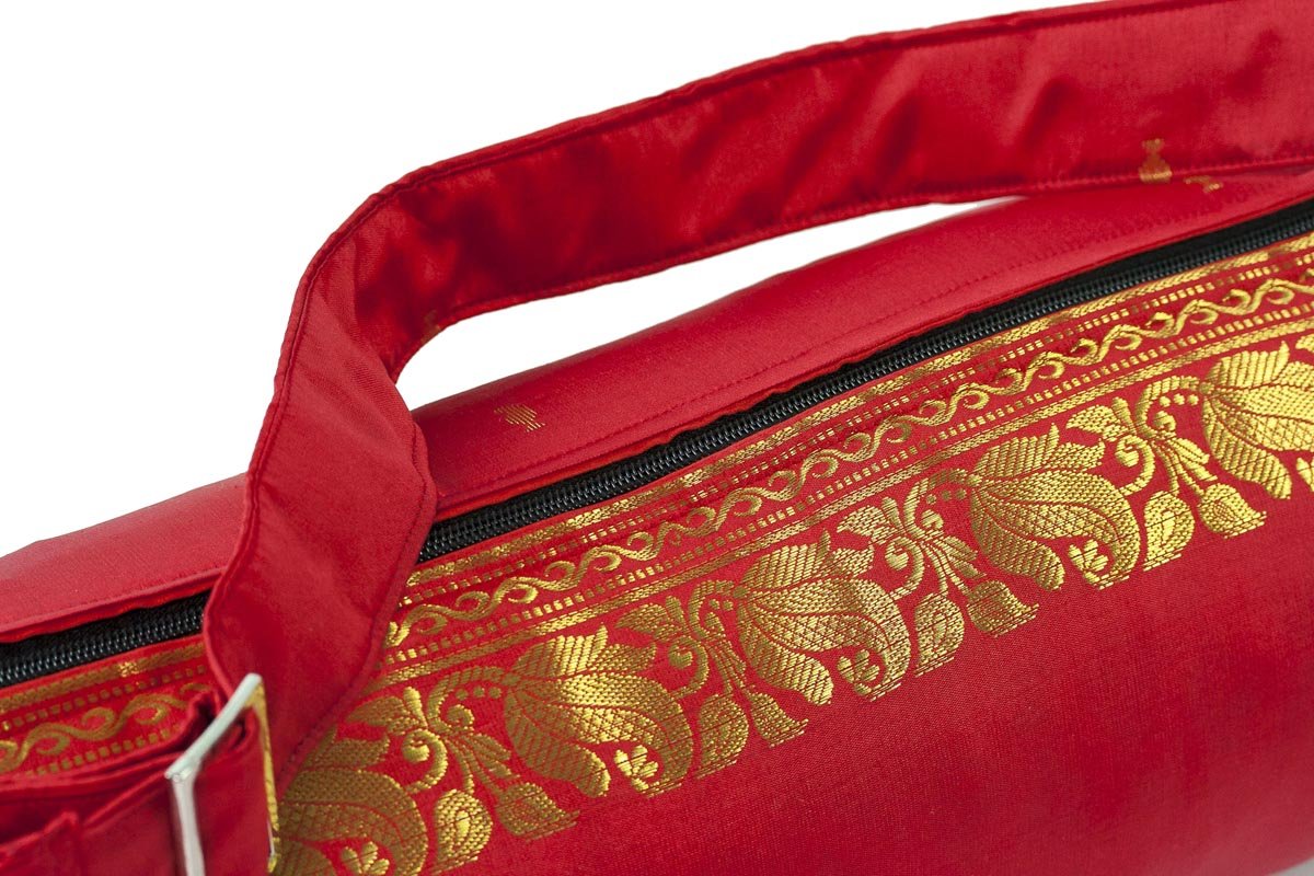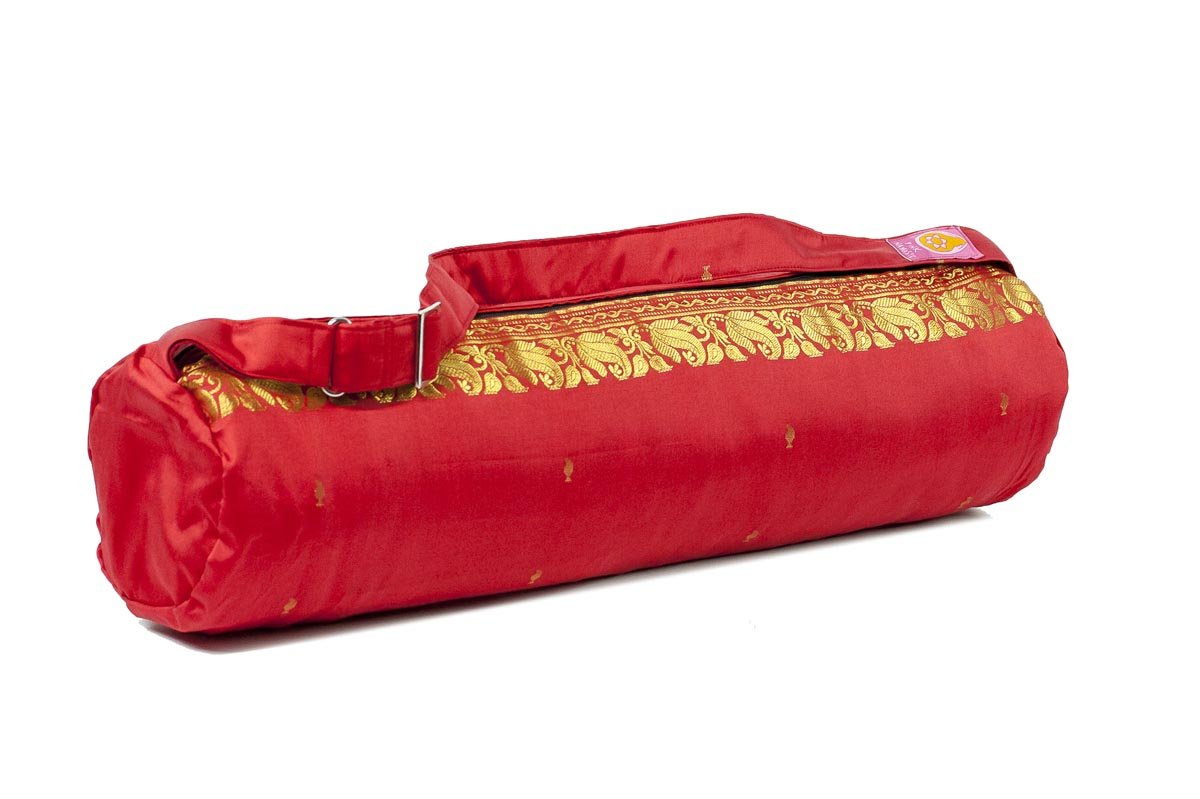 These beautiful Yoga mat bags are handmade in Coimbatore, South India, using saris as the primary material. Double Zipper. They have a little secret pocket-safe inside and are lined with pure cotton. Each model is a limited edition with no more than 7 unique bags available.