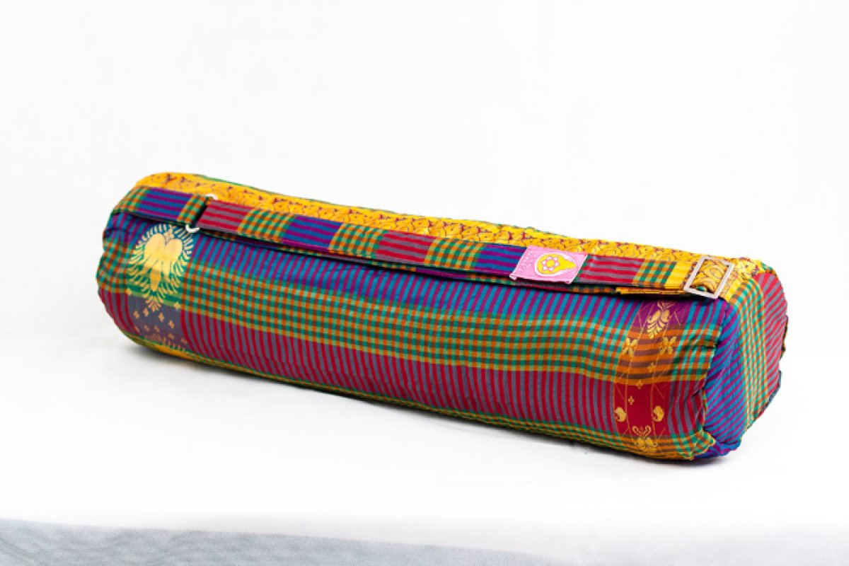 These beautiful Yoga mat bags are sewn in Coimbatore, South India under strict fair trade standards, using saris