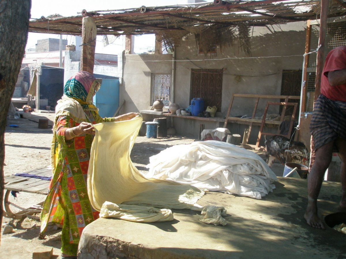 1. The fabric is “yellow” dyed in a harda solution, which allows the natural dyes to adhere to the fabric and become colorfast. Harda is extracted from fruits of the myrobalan plant (terminlia chebula). The yellow dyed fabric is dried in open fields under the bright Indian sun. The fabric is now a yellowish cream color (unique to the Bagru printing process) and is ready for printing.